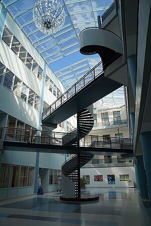 Im University Medical Center Groningen (Niederlande) wurde über der Magistrale ein bewegliches Glasdach konstruiert, das bei schönem Wetter komplett geöffnet werden kann. Im Spital hat man so eher das Gefühl, durch eine Stadt zu flanieren als im Spital zu sein.