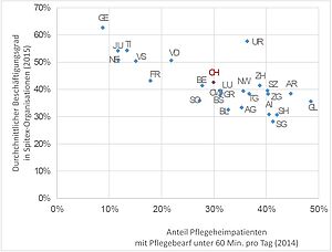 Doch wann sollten Patienten zu Hause, wann in Pflegeheimen gepflegt werden? Gemäss Studien der Spitex Schweiz und des Schweizer Gesundheitsobservatoriums Obsan ist die Behandlung durch Spitex günstiger für Personen, die weniger als 60 Minuten Pflege pro Tag benötigen. Hingegen ist die Pflege in einem Heim, inklusive Betreuung und Hotellerie, ab einem täglichen Pflegebedarf von 120 Minuten finanziell sinnvoller. Dazwischen liegt ein grauer Bereich, je nach Krankheitsbild, Wohnsituation und Ressourcen im persönlichen Umfeld. Ambulante und stationäre Angebote sind also komplementär. Leichtpflegebedürftige Personen sollten zu Hause, in betreuten Wohnungen oder in Tagesstrukturen, die Schwerpflegebedürftigen hingegen in Heimen gepflegt werden. Es braucht eine Strategie des «ambulant mit stationär» statt «vor stationär». Natürlich sollte dabei jeder Fall stets individuell betrachtet werden. Als Orientierung für die Versorgungsorganisation eines ganzen Kantons oder einer Gemeinde sind jedoch solche Richtwerte sinnvoll. Von dieser optimalen Aufstellung sind wir noch weit entfernt. 30 Prozent der Bewohner in Schweizer Alters- und Pflegeheimen benötigten 2014 weniger als 60 Minuten Pflege pro Tag (AG 35%, ZH 39%, SH 42%, GL 49%). Viele dieser Bewohner könnten zu Hause mit Hilfe von Spitex-Diensten gepflegt werden.