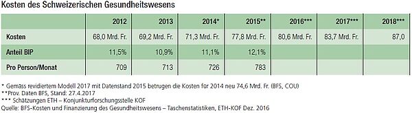 Auf rund 77,8 Milliarden Franken oder 783 Franken pro Kopf der Schweizer Bevölkerung beliefen sich im Jahr 2015 die Kosten für das schweizerische Gesundheitswesen 1. Diese Gesundheitskosten steigen jährlich. Der Trend werde sich nicht nur 2016 (+3,6%) sondern – so die Konjunkturforschungsstelle der ETH Zürich (KOF) – auch 2017 und 2018 (je +3,9%) fortsetzen. Der Anteil der Gesund heitsausgaben am Bruttoinlandprodukt werde daher bis 2018 auf 12,2 Prozent steigen. Gründe seien unter anderem die demografische Entwicklung und die konjunkturelle Erholung mit leicht steigenden Löhnen. Diesem Kostenanstieg hält der Bundesrat dagegen. Mit der Strategie «Gesundheit 2020» will er erhebliche Einsparungen erzielen. Die ökonomischen Folgen der geplanten Massnahmen 2 – eine Ausnahme bilden diejenigen im Medikamentenbereich – seien gemäss KOF jedoch noch nicht konkret genug, um eine günstigere Prognose zu stellen.
