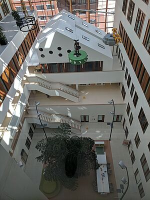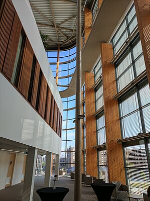Die kompakte Gebäudehülle mit hochwertiger Dämmung und Mehrfachverglasung vermeidet unnötige Wärmeverluste im Winter und eine Aufheizung im Sommer. Mit Erdwärme/Geothermie wird das Gebäude im Sommer gekühlt und im Winter beheizt. Selbst der Lift arbeitet effizient: Wenn er anhält, wird die freigesetzte Energie gespeichert und später zum Anfahren genutzt.