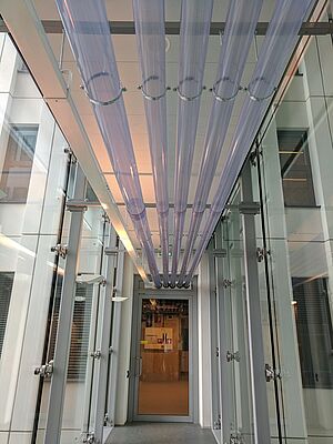 So sind in den Bädern und Toiletten Automatikschalter verbaut, die das Licht beim Betreten ein- und kurz nach Verlassen des Raumes wieder ausschalten. Mehrheitlich funktioniert die Beleuchtung aber nicht nur nach Präsenz, sondern auch auf die Helligkeit des Tageslichts abgestimmt: Nachts schaltet die Beleuchtung beispielsweise in den Fluren ein, wird es dann mit Tagesanbruch heller, dimmt die künstliche Beleuchtung automatisch herunter, so dass einerseits immer ein definierter Helligkeitswert erreicht, andererseits keine unnötige Lichtenergie verschwendet wird. Im Sommer fahren die Storen automatisch bei direktem Sonneneinfall herunter. Räume, die nicht in Gebrauch sind, werden zudem nicht unnötig beheizt und gekühlt. Auch der Hubschrauberlandeplatz ist in das intelligente System eingebunden: Ist ein Hubschrauber im Anflug oder will starten, schaltet die Beleuchtung der Plattform ein und die Jalousien der benachbarten Fenster fahren automatisch nach oben.