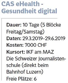 Der CAS eHealth ist anerkannt durch das Schweizerische Institut für ärztliche Weiter- und Fortbildung SIWF-FMH als Fortbildungsveranstaltung mit 25 Credits. Er kann auch als vollständiger Online-Kurs besucht werden. Weitere Informationen sowie der detaillierte Lehrplan sind erhältlich unter info(at)ikf.ch.