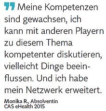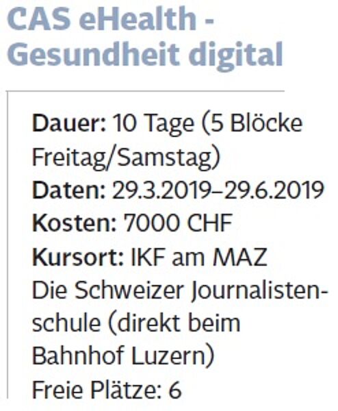 Der Zertifikatskurs «eHealth – Gesundheit digital», der am 29. März 2019 zum 9. Mal startet, beleuchtet all diese genannten Themen der digitalen Transformation und künftigen Entwicklungen, Märkte und Prozesse im Gesundheitswesen.