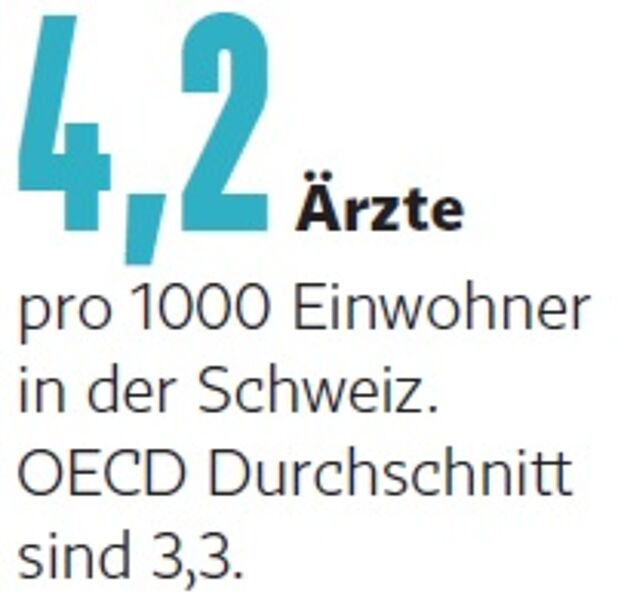 Gemäss FMH lag die Schweiz 2016 mit einer «Ärztedichte von 4,2 (Ärztinnen und Ärzte pro 1000 Einwohnerinnen und Einwohner, beziehungsweise 3,8 in Vollzeitäquivalenten) über dem OECD-Durchschnitt von 3,3 (OECD-Bandbreite >1,0 und <7,0), aber ungefähr gleichauf mit Nachbarländern wie Deutschland und Frankreich, deutlich niedriger als Österreich». Interessant dabei: Rund ein Drittel der bei uns tätigen Ärzte stammt aus dem Ausland. Die Expertengruppe schlägt in ihrem Bericht denn auch vor, die Ärztedichte zu stabilisieren oder gar zu reduzieren und damit die Nachfrage nach Leistungen zu senken. Entsprechend sei der auf drei Jahre befristete Art. 55a KVG – Bedürfnisklausel für die Ärzte-Zulassung – in eine dauerhafte Massnahme umzuwandeln.