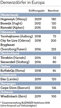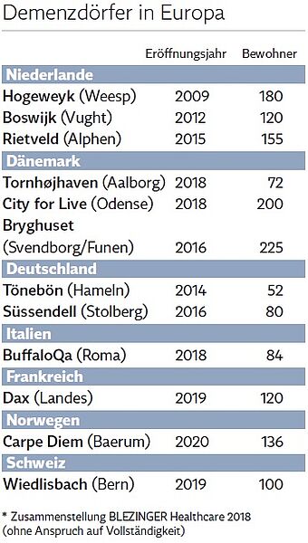 Das Architekturbüro Molenaar&Bol&VanDillen Architecten, das de Hogeweyk realisiert hat, übertrug seine Erfahrungen in ein weiteres Demenzdorf in Dänemark, Aalborg. Inzwischen hat sich die Idee verbreitet und es sind weitere Demenzdörfer geplant bzw. bereits realisiert (Tabelle 1).