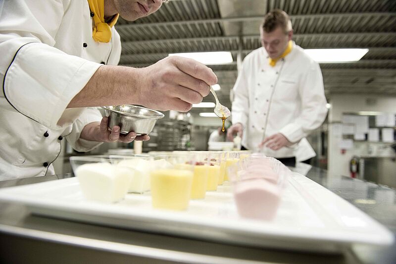 Oft verwendet wird Hot fill: Mit diesem Verfahren wird die Suppen- und Saucenbasis vorproduziert. Remo Stalder veranschaulicht: «Wir füllen die Suppen, wenn sie 86°C Grad heiss sind, in Beutel ab. Diese werden nicht vakuumiert, sondern zweimal verschweisst. Anschliessend legen wir die verschlossenen Beutel flach in den Schockfroster FrigoJet zum Schnellkühlen.» Diese Methode hat sich auch aus hygienischer Sicht bewährt. Die Laboranalysen zeigen, dass die Produkte – mikrobiologisch überprüft − bis zu 21 Tage problemlos gekühlt haltbar sind. Und: Gemäss Stalder können die Köche dank dem Hot fill-Verfahren mit mehr Frischprodukten arbeiten, was das Geschmackserlebnis merklich steigert.