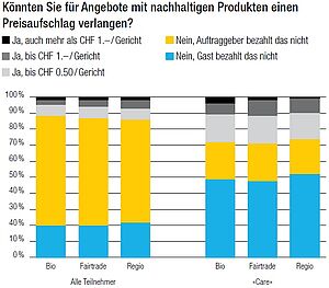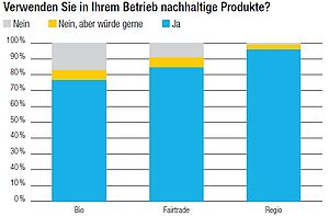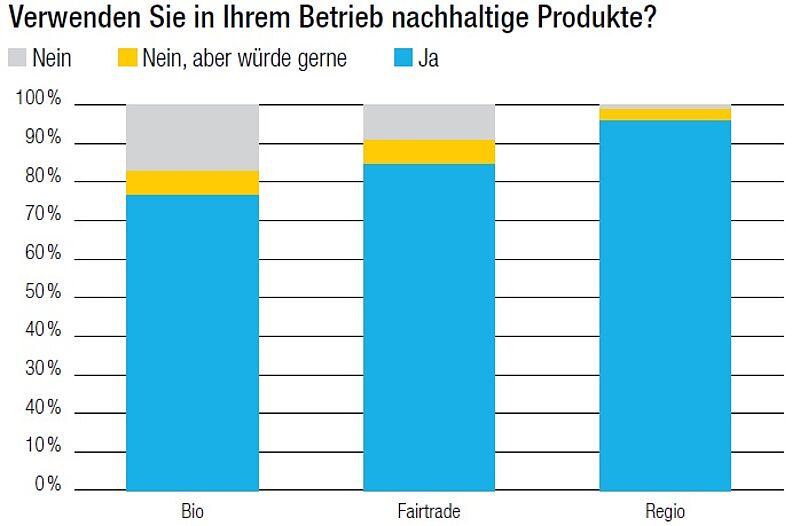 Das Bewusstsein für nachhaltige Produkte in der Gemeinschaftsgastronomie nimmt zu. 2010 beteiligten sich knapp 20 Prozent der Mitglieder an der Umfrage zur Verwendung nachhaltiger Lebensmittel, vor zwei Jahren waren es 63 Prozent. Ein noch klareres Indiz: 2010 sagte noch fast die Hälfte der Befragten, dass keine nachhaltigen Produkte eingesetzt werden. Nun geben 77 Prozent an, dass sie Bio-Produkte verwenden, 85 Prozent verwenden Fairtradeund 96 Prozent Regio-Produkte. Deutlich zugenommen hat der Anteil Betriebe, die täglich Bio-Produkte verwenden. Wie nachhaltig das Gesamtangebot eines Betriebes ist, lässt sich aus der Umfrage jedoch nicht ableiten. In der Umfrage wurde weder nach dem Mengenanteil nachhaltiger Produkte am Gesamtangebot gefragt, noch wurde vom Verband eine «Definition» zu Nachhaltigkeit oder Nachhaltigkeitskriterien vorgegeben.