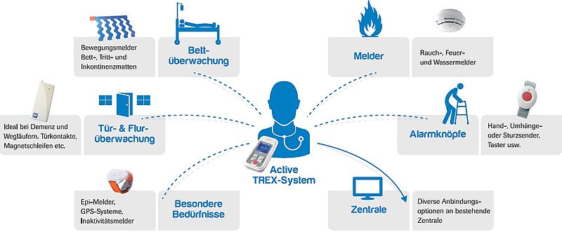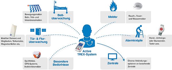 Active Care aus Zug bietet beispielsweise funkgesteuerte Rufsysteme, Weglaufsperren, sprechende Agenden, Erinnerungssysteme sowie Sensoren für nasse Betten und Stürze an. «Funksysteme sind günstig und flexibel», sagt Ivan Zavagni, Leiter der Beratung bei Active Care. Das Unternehmen schneidet die Systeme auf Kundenbedürfnisse zu und kann sie etwa zur Erweiterung vorhandener Rufsysteme einbauen. Tragbare Sender für Patienten kosten um 160 Franken, Positionsmelder um 220, Türalarme um 360 und zentrale Empfänger mit Display für Pflegekräfte knapp 800 Franken. Sie sind Teile des TREX-Systems. Dieses erkennt, ob jemand stürzt, aufsteht, sich nicht mehr bewegt oder ein Gebäude verlässt. Es erfasst Epilepsie und Inkontinenz oder verhindert etwa, dass Menschen in «falsche» Räume eindringen. Das TREX-Display zeigt an, was im Heim wann und wo passiert. Pflegekräfte wissen sofort, wie und wie schnell sie reagieren müssen. Diese Daten lassen sich speichern und auswerten: Wer läutet wie oft? Wie schnell kommt Hilfe? So kann man Pflegebedarf und -verfügbarkeit optimal anpassen. Bei Unfällen ist die Dokumentation der Abläufe oft hilfreich.