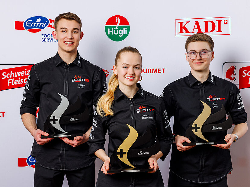 Céline Grossmann überzeugte die zwei Jurys mit der geforderten «Mystery Soup» in Form einer Petersilienwurzelsuppe mit Einlage als Vorspeise sowie Teriyaki Flat Iron vom japanischen Grill mit Yuzu-Sauce, Bao Bun mit sautiertem Nierenzapfen, dazu gedämpfte Schwarzwurzel, Miso-Zwiebel, Belper-Knolle-Krokette und Mezcal-Cocktail als Hauptspeise. Ihr Gewinn: ein zweiwöchiger Aufenthalt in Singapur mit Kücheneinblicken bei Julien Royer im Restaurant Odette. Auf dem zweiten Platz landete Nicolas Imholz vom Altersheim Spannort in Erstfeld, der nach 2024 bereits zum zweiten Mal im Finale war. Er darf nun für eine Woche nach Salzburg und dort bei Martin Ebert im Restaurant Ikarus einen Blick hinter die Kulissen werfen. Der dritte Preis – eine Woche in der Zentralschweiz mit spannenden Tagen bei Mike Wehrle im Bürgenstock Resort – ging an Ben Cesa vom Culinarium Alpinum in Stans. Damit sind dieses Jahr gleich alle drei Erstplatzierten bereits im dritten Ausbildungsjahr.