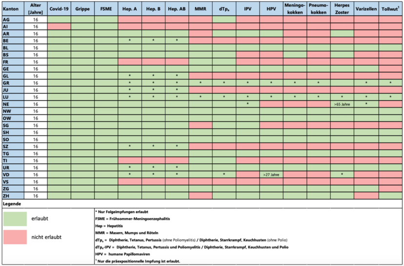 In der Schweiz dürfen Apothekerinnen und Apotheker Impfungen durchführen, jedoch variieren die erlaubten Impfungen je nach Kanton. Beispielsweise sind im Kanton Bern Impfungen gegen Hepatitis A und B erlaubt, während im Kanton Freiburg Impfungen gegen Masern, Mumps, Röteln (MMR) sowie Diphtherie und Tetanus (dTp) gestattet sind.